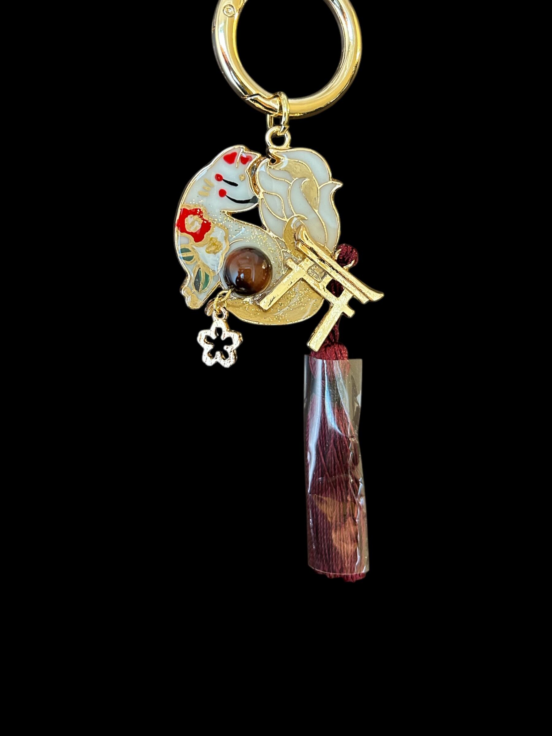 No,66 御天狐守り 白 キツネのお守り 天然石・レッドタイガーアイ付き デザイナーmasuramiの手描きレジン作品 Handmade fox charm きつねのお守り 京都お守りチャーム