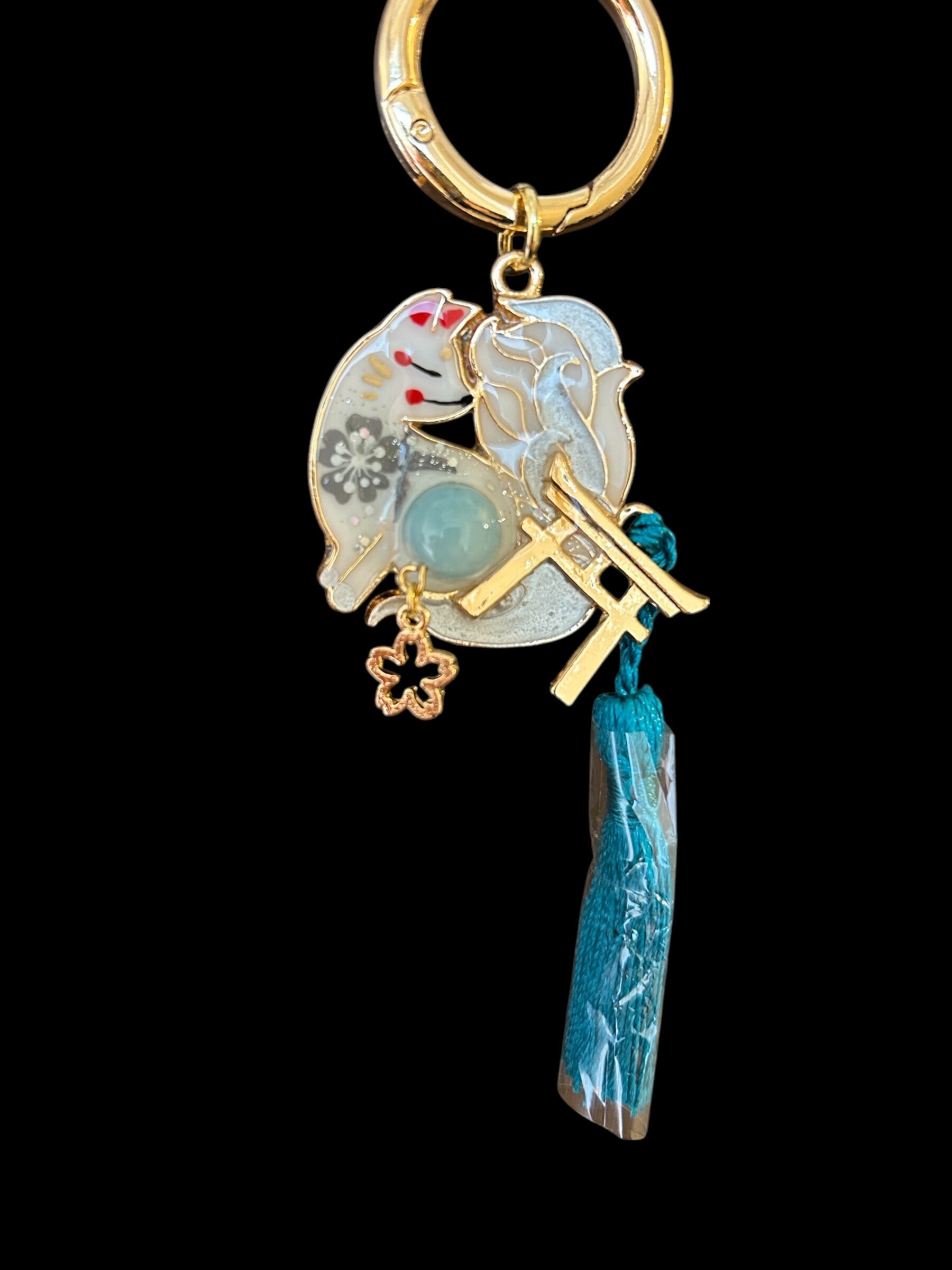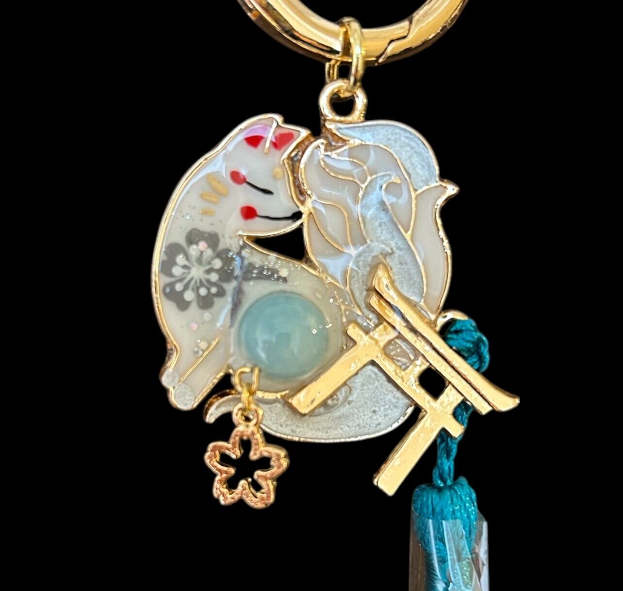 No,68 御天狐守り 白 キツネのお守り 天然石・ブルークォーツァイト付き デザイナーmasuramiの手描きレジン作品 Handmade fox charm きつねのお守り 京都お守りチャーム