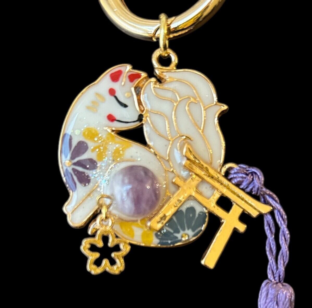 No,69 御天狐守り 白 キツネのお守り 天然石・ラベンダーアメジスト付き デザイナーmasuramiの手描きレジン作品 Handmade fox charm きつねのお守り 京都お守りチャーム