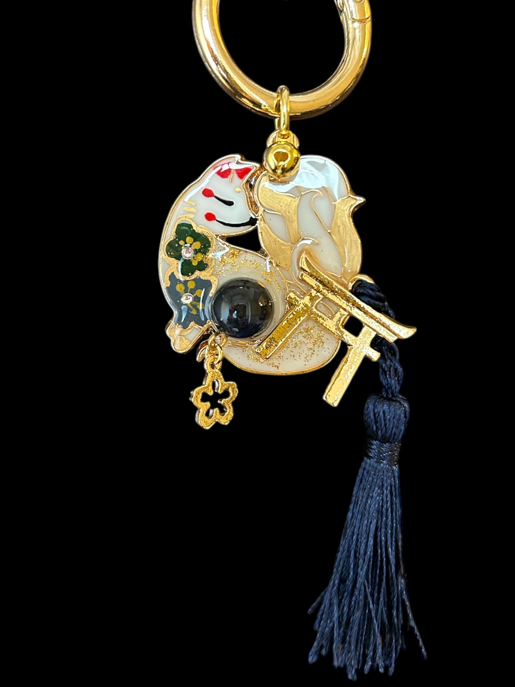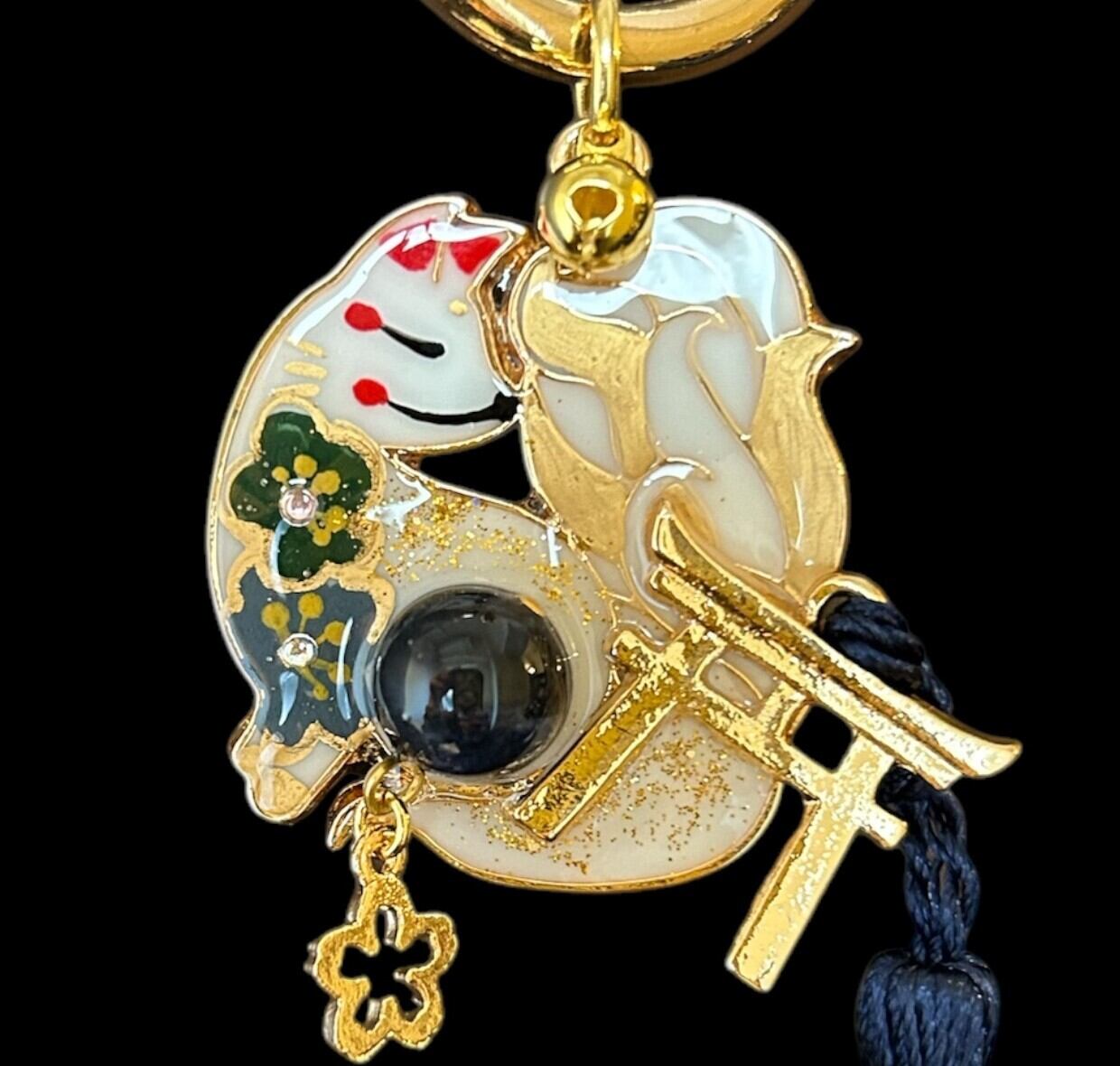 その2匹の狐が パワーストーンや鳥居のシンボル、邪気を払う鈴をまとい、デザイナーmasuramiの絵付けによって命を吹き込まれ、美しく可愛らしい御守りとして誕生しました。
