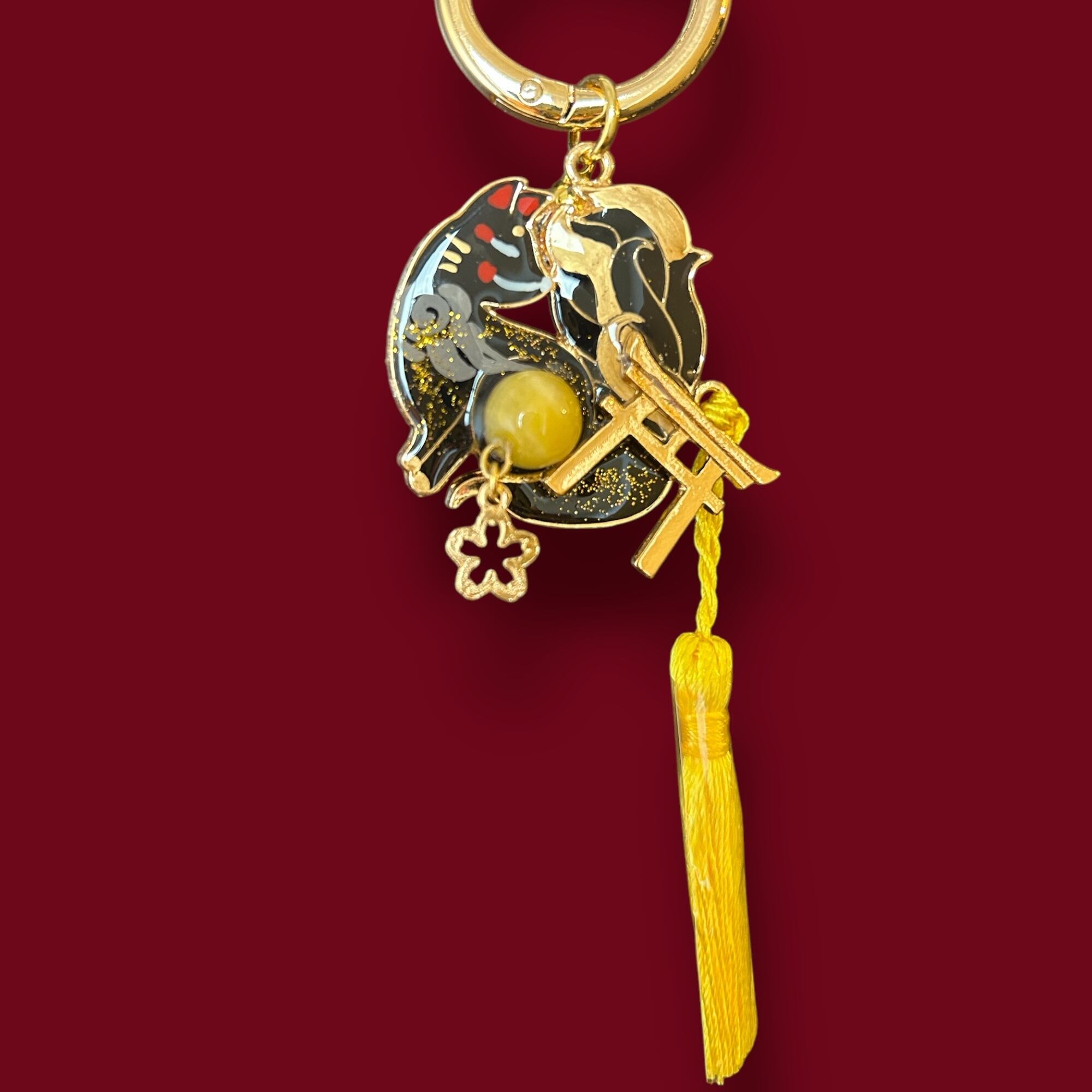 No,79 御天狐守り 黒 キツネのお守り 天然石・ゴールデンタイガーアイ付き デザイナーmasuramiの手描きレジン作品 Handmade fox charm きつねのお守り 京都お守りチャーム