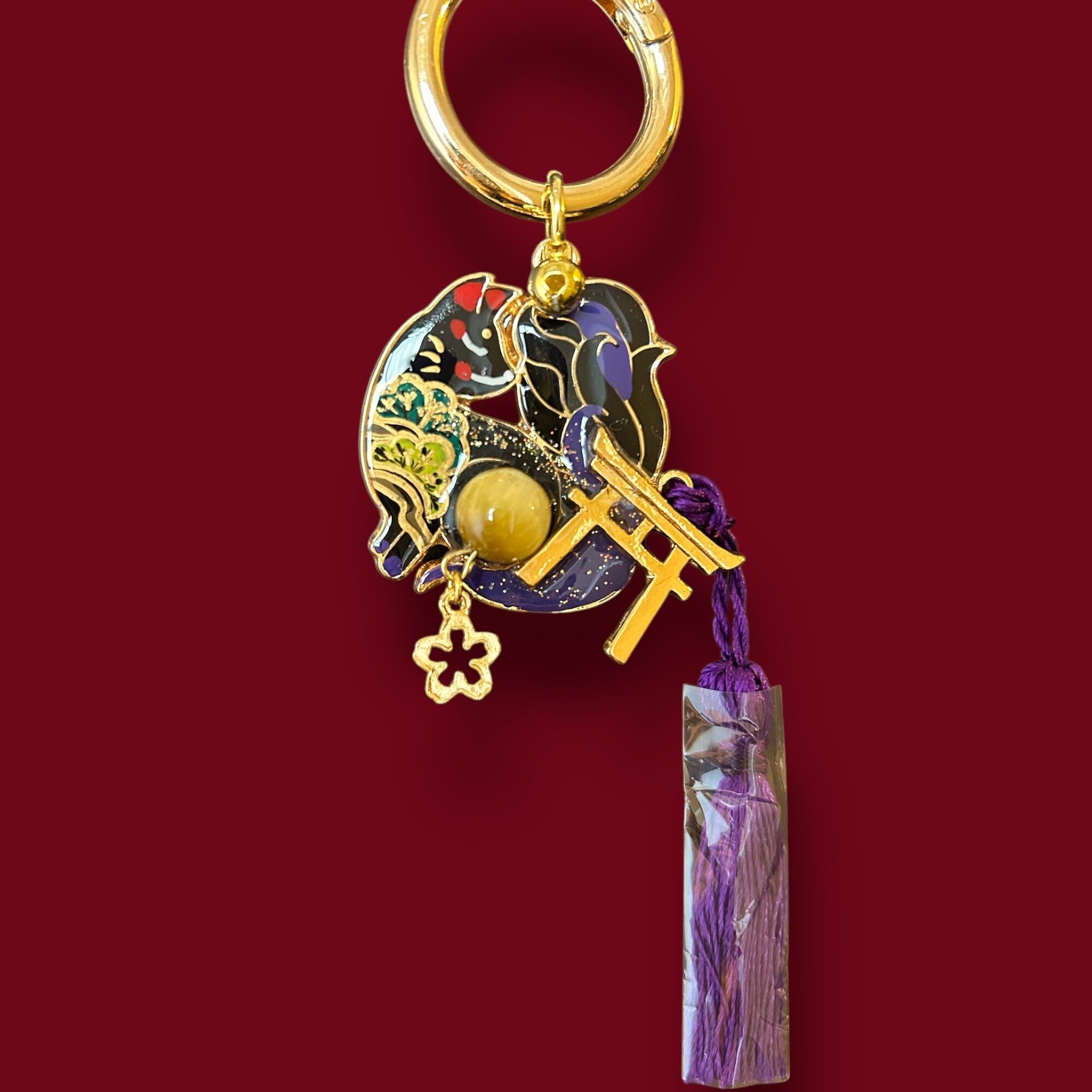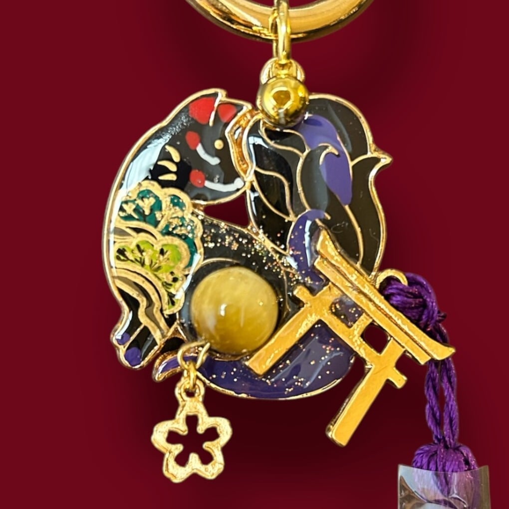No,80 御天狐守り 黒 キツネのお守り 天然石・ゴールデンタイガーアイ付き デザイナーmasuramiの手描きレジン作品 Handmade fox charm きつねのお守り 京都お守りチャーム