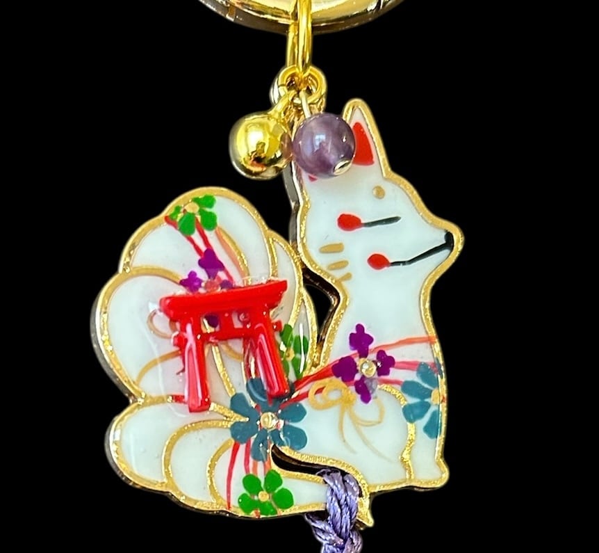 No,85子天狐守り 白 キツネのお守り 天然石・アメジスト付き デザイナーmasuramiの手描きレジン作品 Handmade fox charm きつねのお守り 京都お守りチャーム | KOTODAMAYA