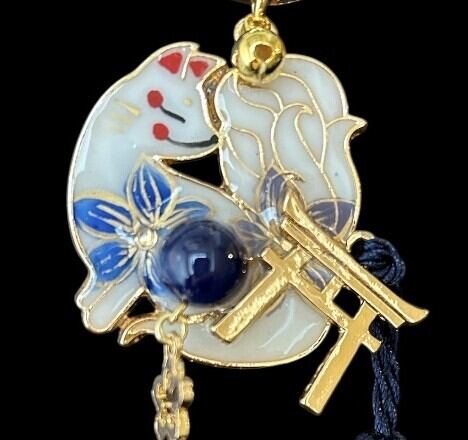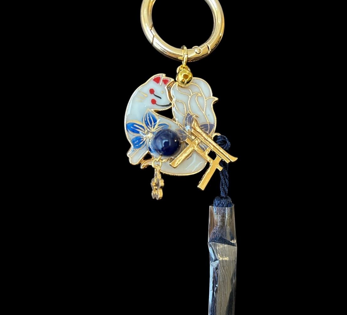 その2匹の狐が パワーストーンや鳥居のシンボル、邪気を払う鈴をまとい、デザイナーmasuramiの絵付けによって命を吹き込まれ、美しく可愛らしい御守りとして誕生しました。