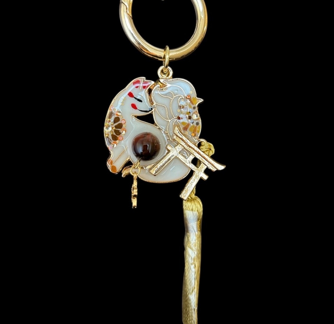 その2匹の狐が パワーストーンや鳥居のシンボル、邪気を払う鈴をまとい、デザイナーmasuramiの絵付けによって命を吹き込まれ、美しく可愛らしい御守りとして誕生しました。