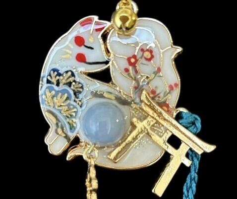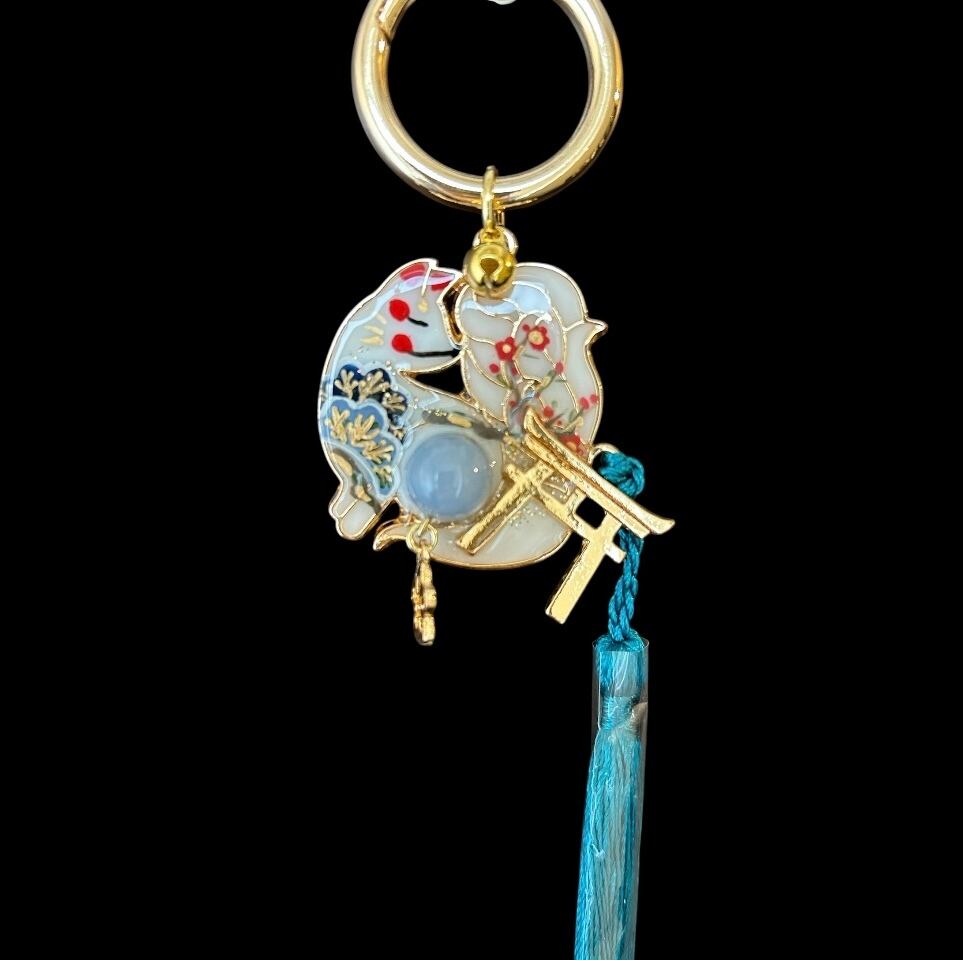 その2匹の狐が パワーストーンや鳥居のシンボル、邪気を払う鈴をまとい、デザイナーmasuramiの絵付けによって命を吹き込まれ、美しく可愛らしい御守りとして誕生しました。