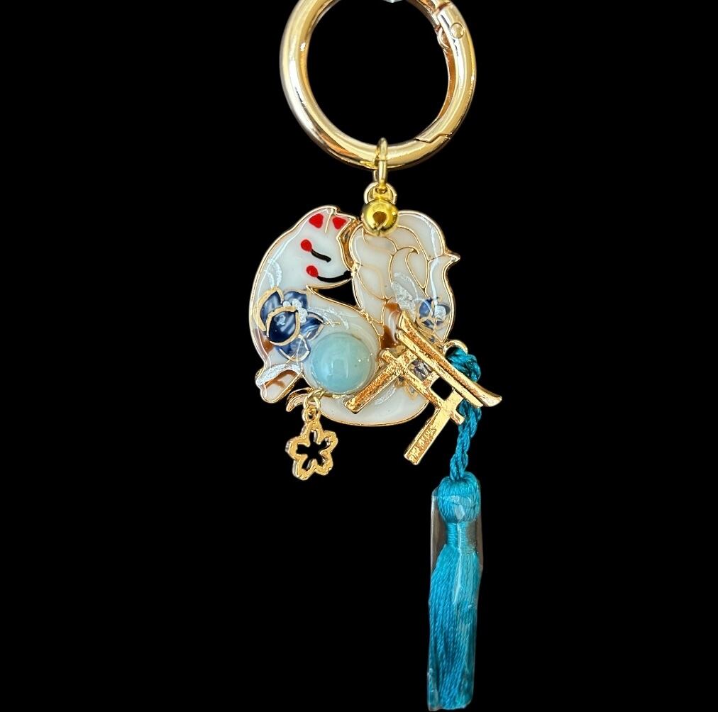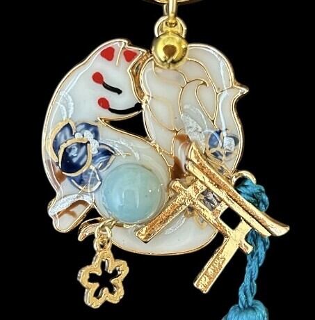 その2匹の狐が パワーストーンや鳥居のシンボル、邪気を払う鈴をまとい、デザイナーmasuramiの絵付けによって命を吹き込まれ、美しく可愛らしい御守りとして誕生しました。