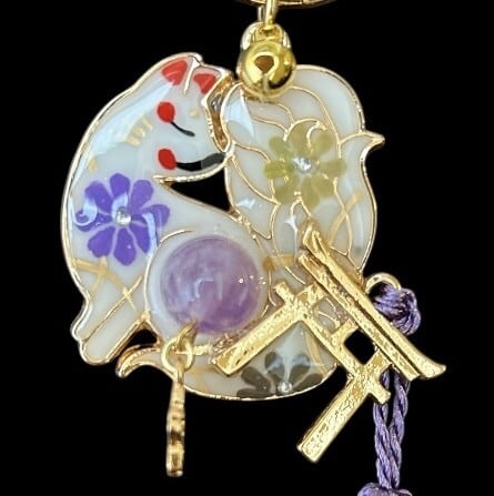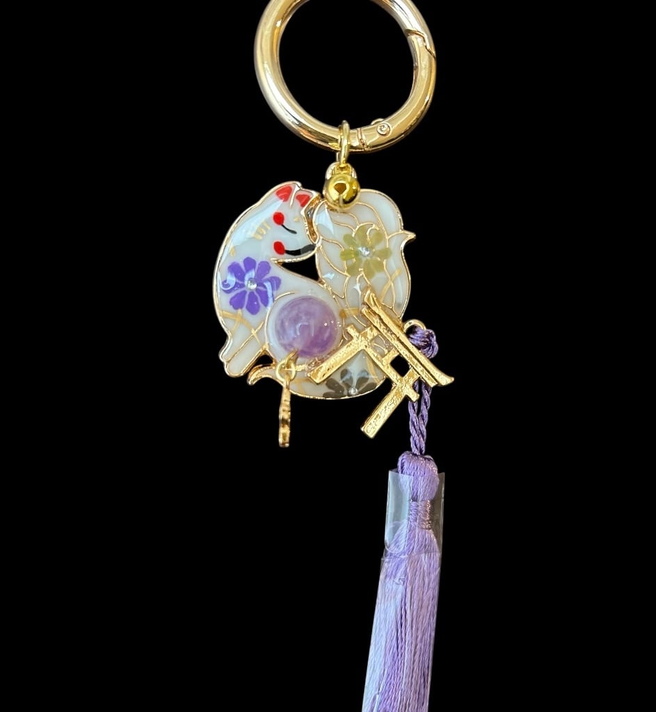 No,97 御天狐守り 白 キツネのお守り 天然石・ラベンダーアメジスト付き デザイナーmasuramiの手描きレジン作品 Handmade fox charm きつねのお守り 京都お守りチャーム
