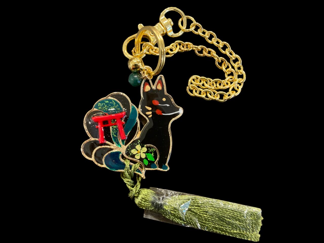No,5 子天狐守り 黒 キツネのお守り 天然石・グリーンアベンチュリン付き デザイナーmasuramiの手描きレジン作品 Handmade fox charm きつねのお守り 京都お守りチャーム