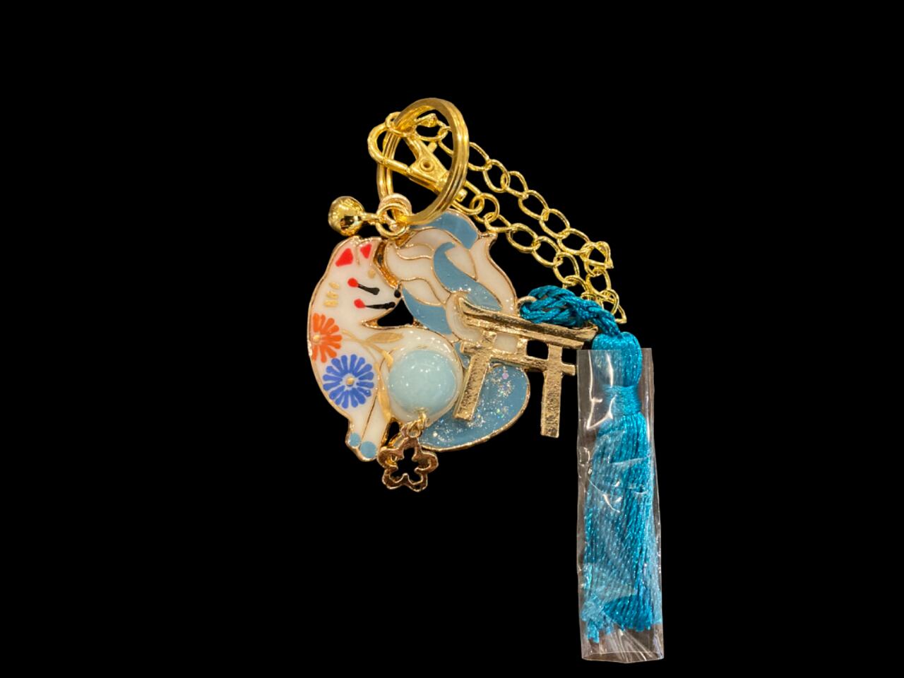 その2匹の狐が パワーストーンや鳥居のシンボル、邪気を払う鈴をまとい、デザイナーasuramiの絵付けによって命を吹き込まれ、美しく可愛らしい御守りとして誕生しました。