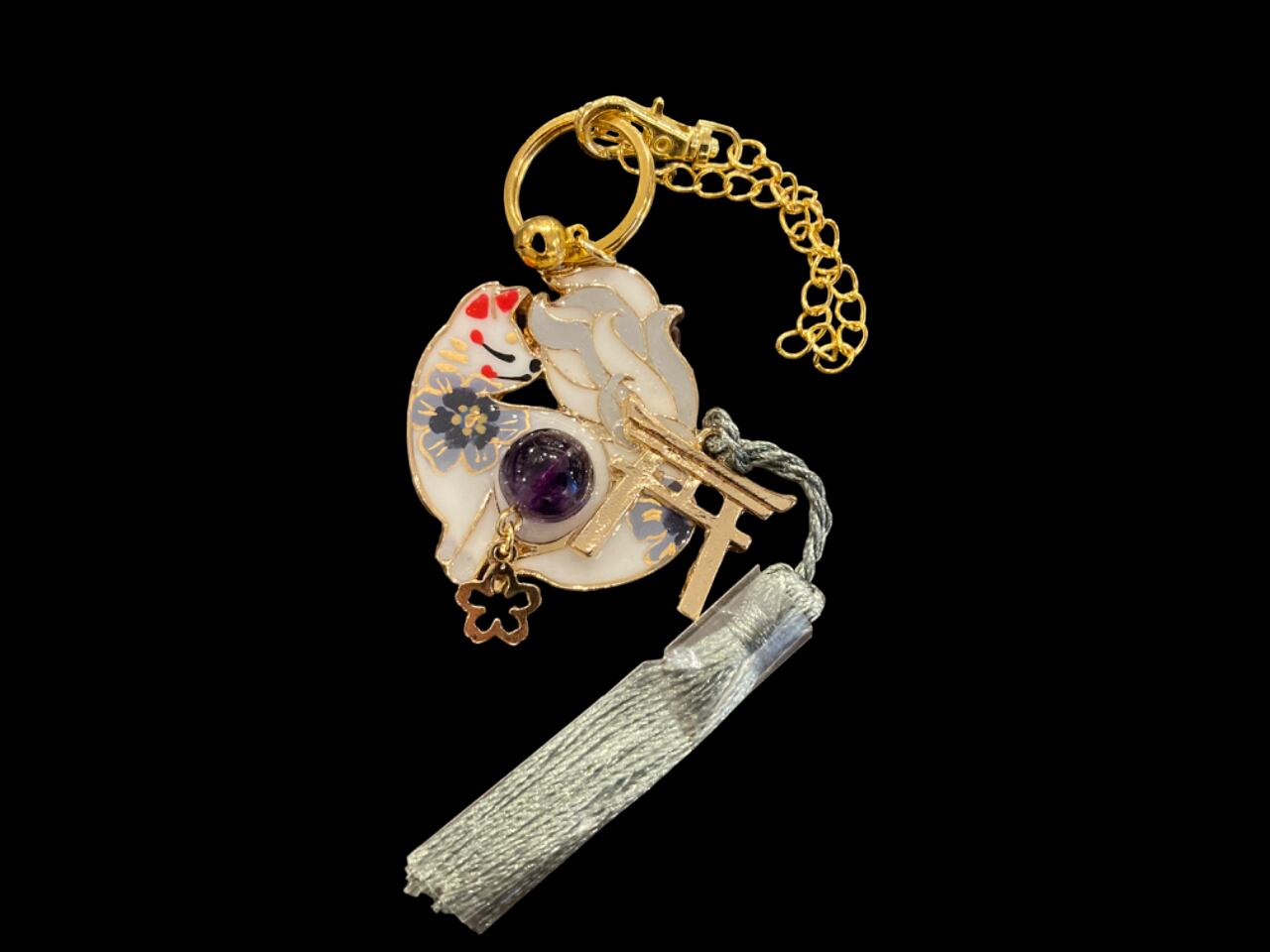No,8 御天狐守り 白 キツネのお守り 天然石・パープルフローライト付き デザイナーmasuramiの手描きレジン作品 Handmade fox charm きつねのお守り 京都お守りチャーム