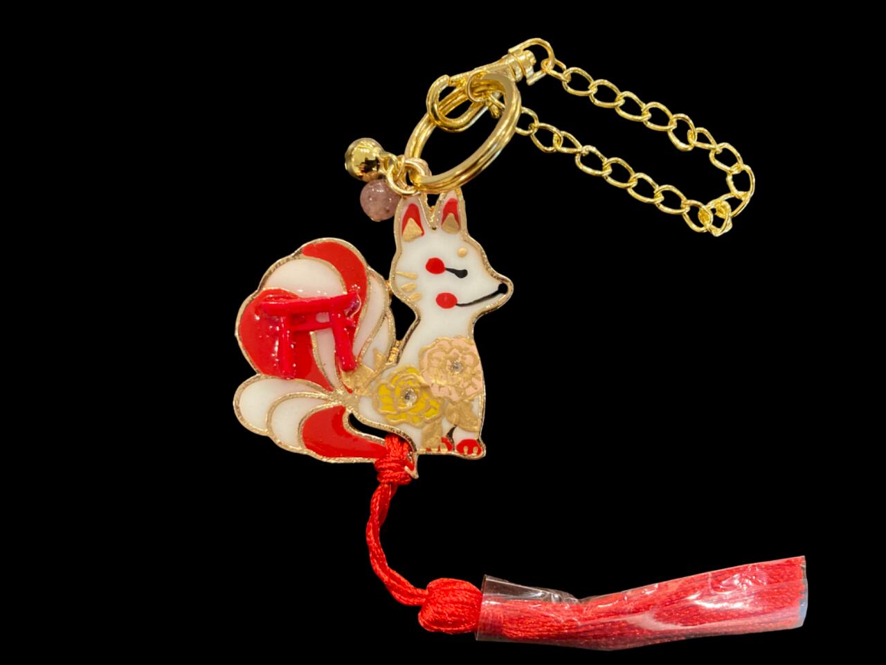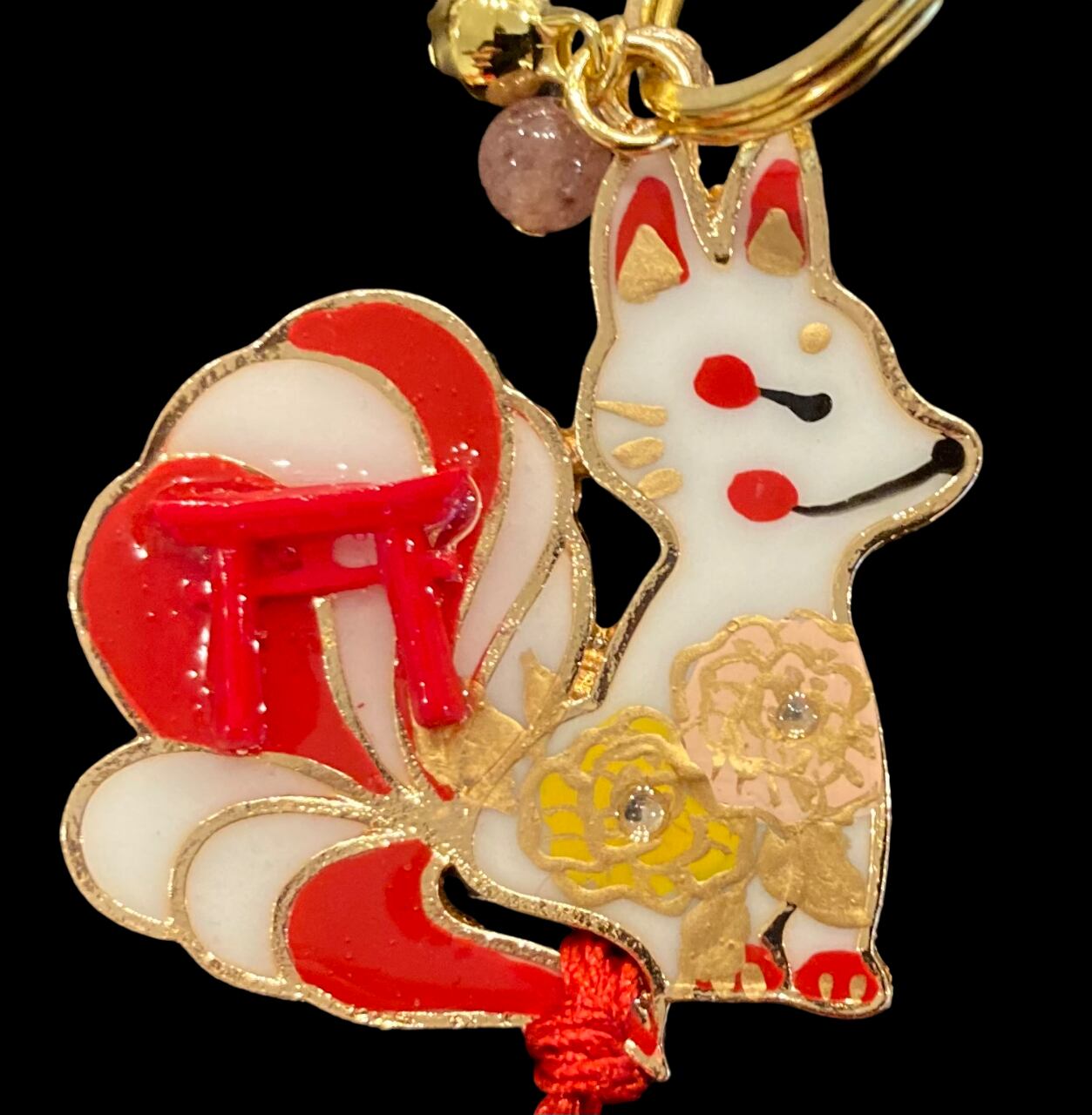 その2匹の狐が パワーストーンや鳥居のシンボル、邪気を払う鈴をまとい、デザイナーmasuramiの絵付けによって命を吹き込まれ、美しく可愛らしい御守りとして誕生しました。