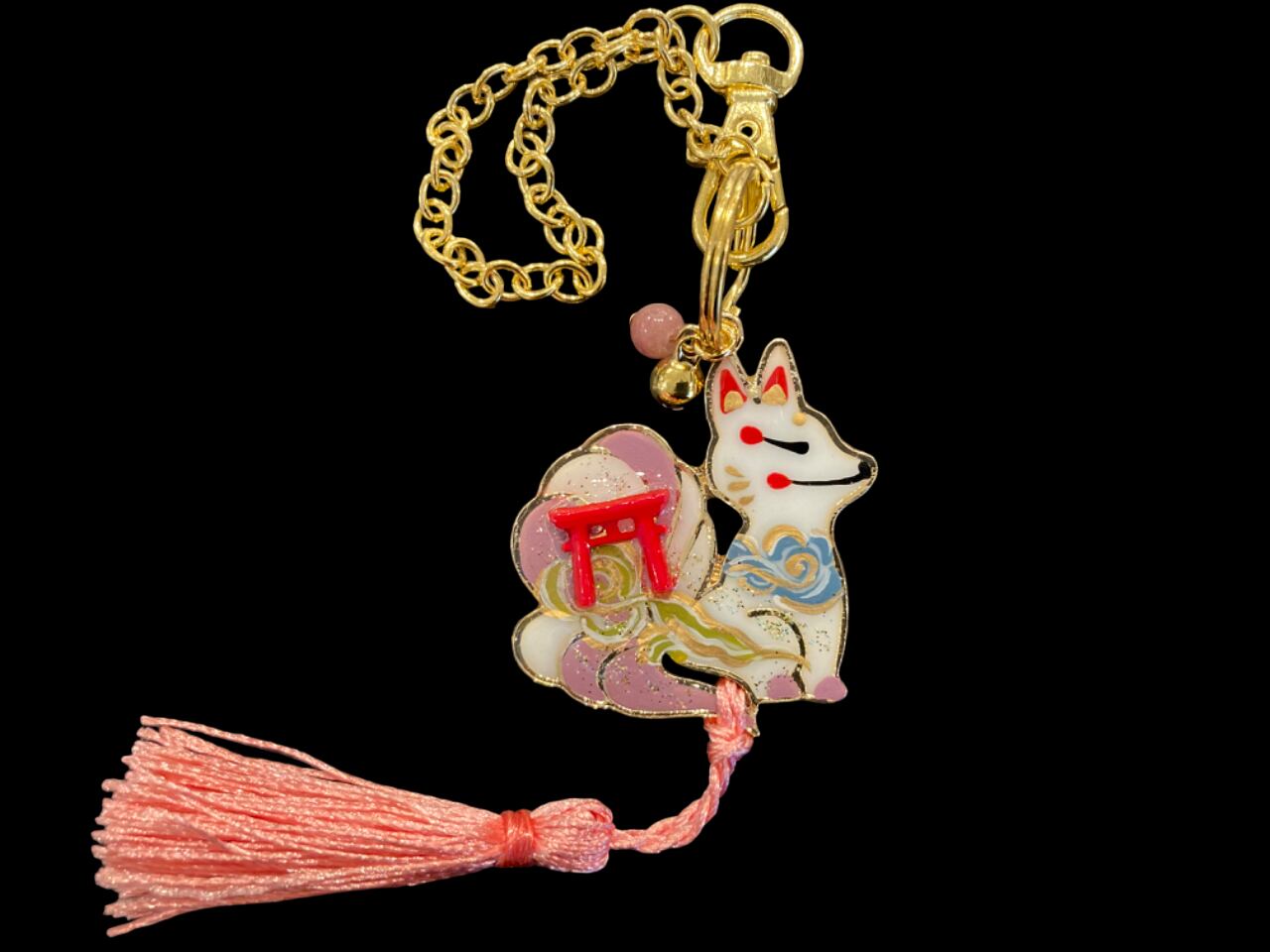 No,18 子天狐守り 白 キツネのお守り 天然石・ピンククォーツ付き デザイナーmasuramiの手描きレジン作品 Handmade fox charm きつねのお守り 京都お守りチャーム
