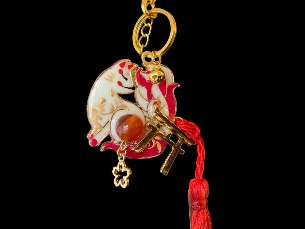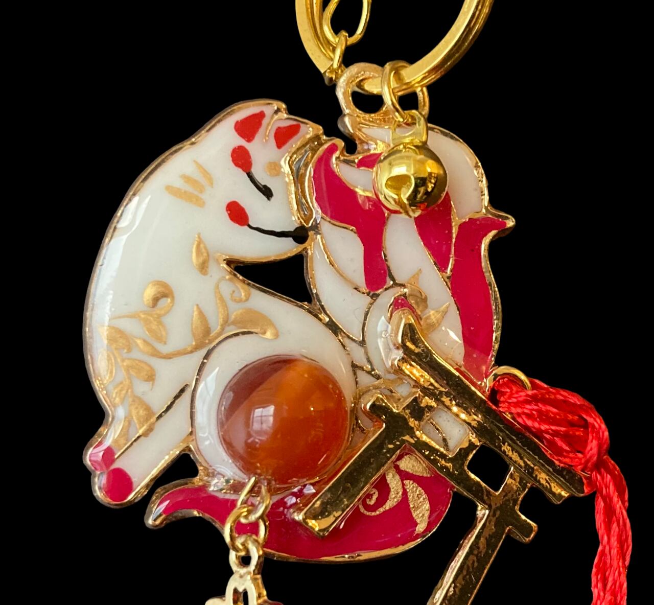 No,23 御天狐守り 白 キツネのお守り 天然石・カーネリアン付き デザイナーmasuramiの手描きレジン作品 Handmade fox charm きつねのお守り 京都お守りチャーム