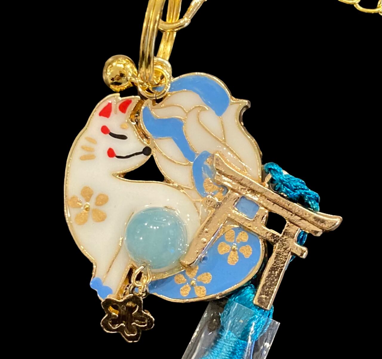 その2匹の狐が パワーストーンや鳥居のシンボル、邪気を払う鈴をまとい、デザイナーmasuramiの絵付けによって命を吹き込まれ、美しく可愛らしい御守りとして誕生しました。