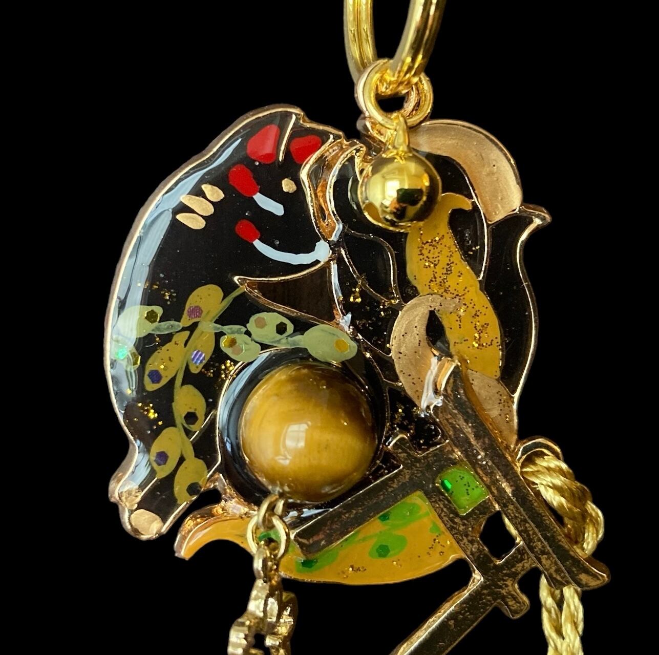 No,26 御天狐守り 黒 キツネのお守り 天然石・タイガーアイ付き デザイナーmasuramiの手描きレジン作品 Handmade fox charm きつねのお守り 京都お守りチャーム