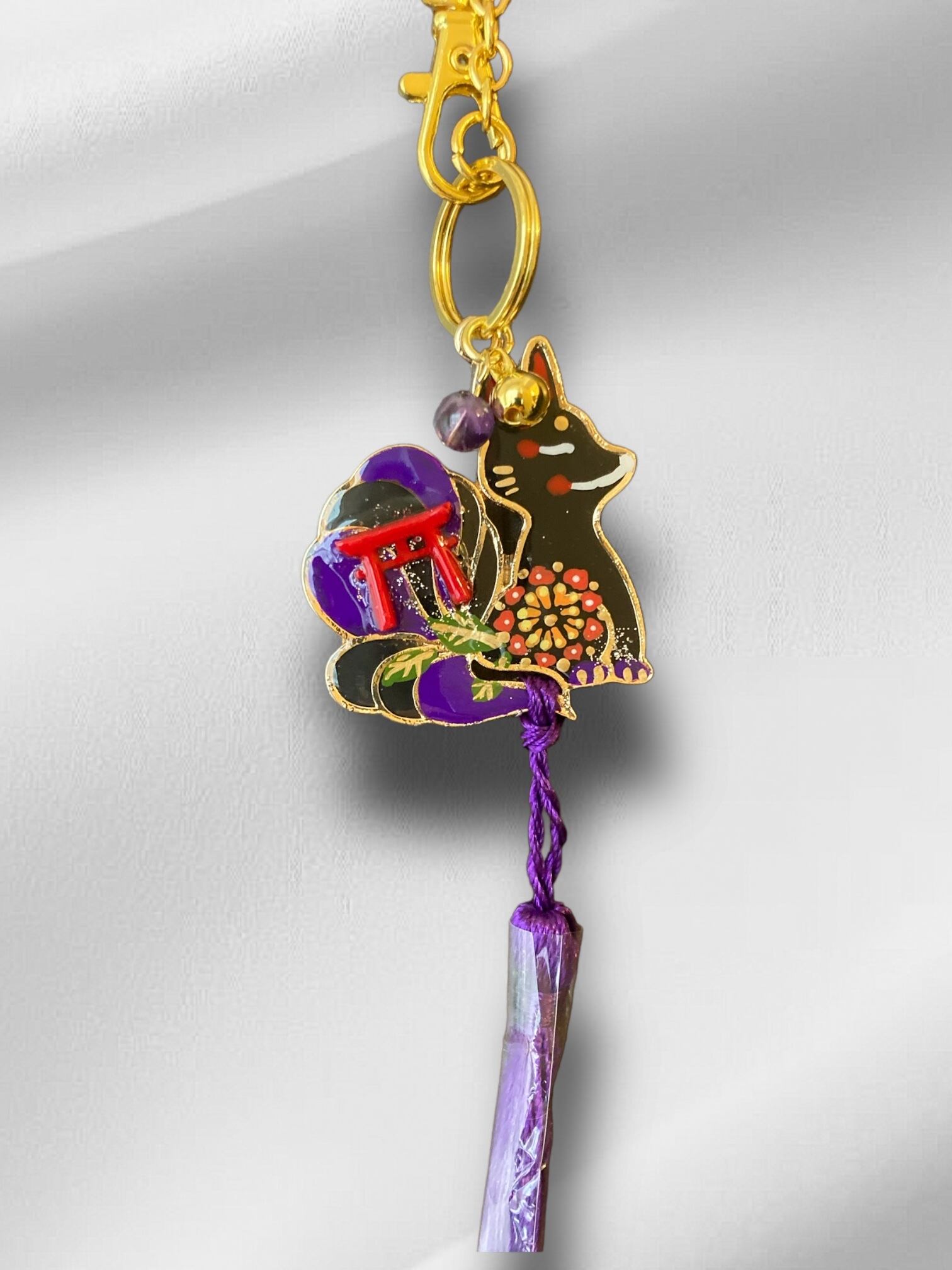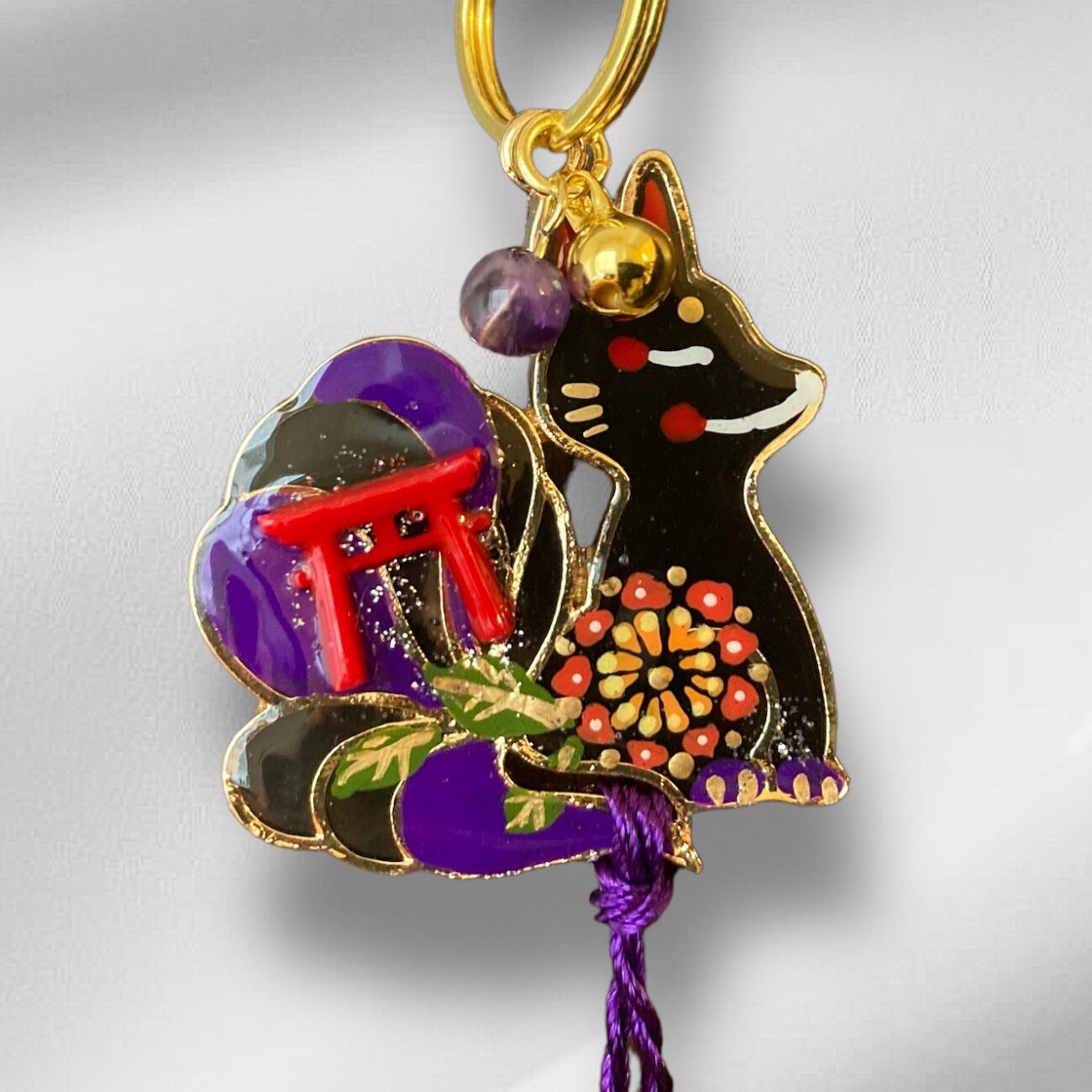 No,31 子天狐守り 黒 キツネのお守り 天然石・アメジスト付き デザイナーmasuramiの手描きレジン作品 Handmade fox charm きつねのお守り 京都お守りチャーム