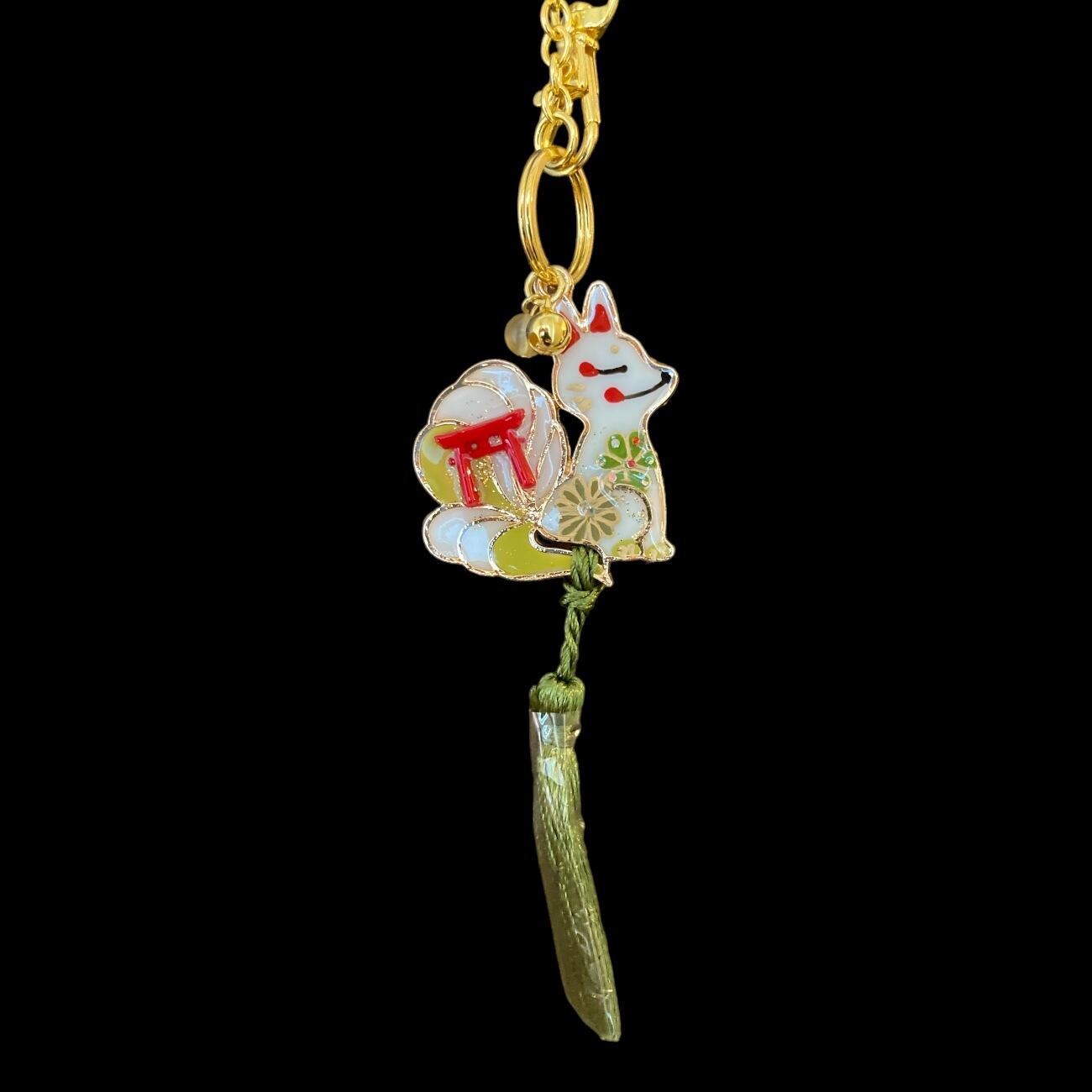No,34 子天狐守り 白 キツネのお守り 天然石・アラゴナイト付き デザイナーmasuramiの手描きレジン作品 Handmade fox charm きつねのお守り 京都お守りチャーム