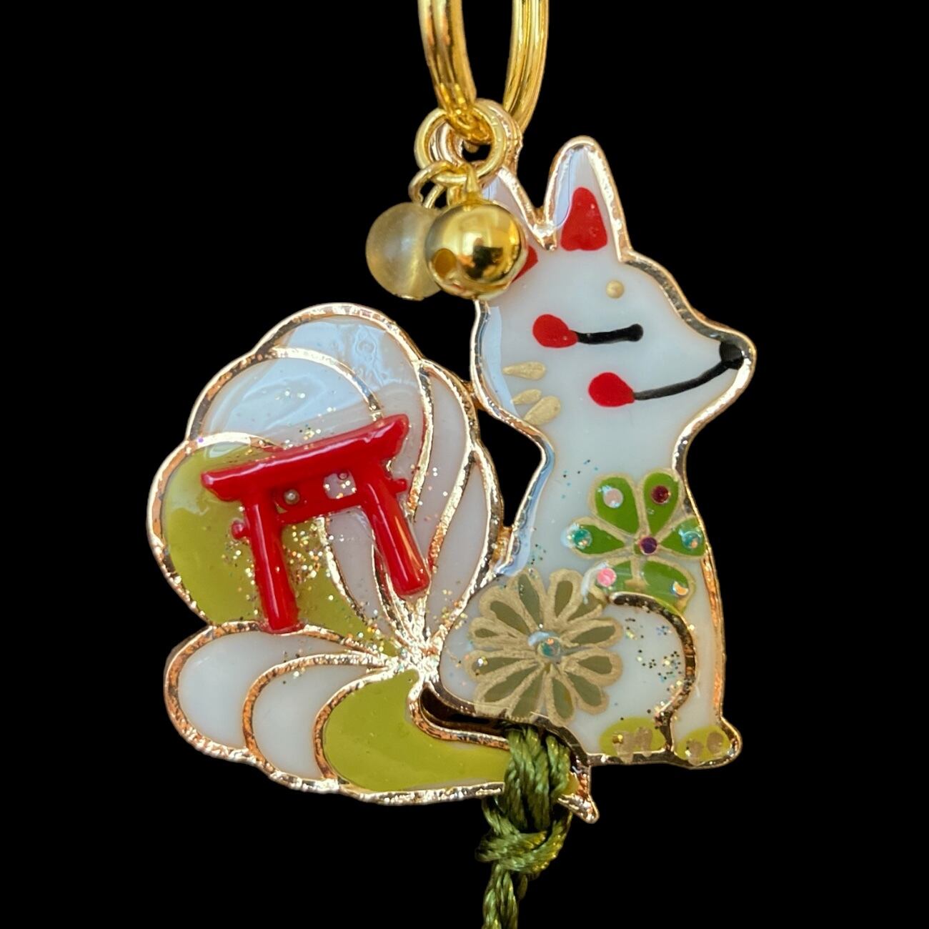 その2匹の狐が パワーストーンや鳥居のシンボル、邪気を払う鈴をまとい、デザイナーmasuramiの絵付けによって命を吹き込まれ、美しく可愛らしい御守りとして誕生しました。