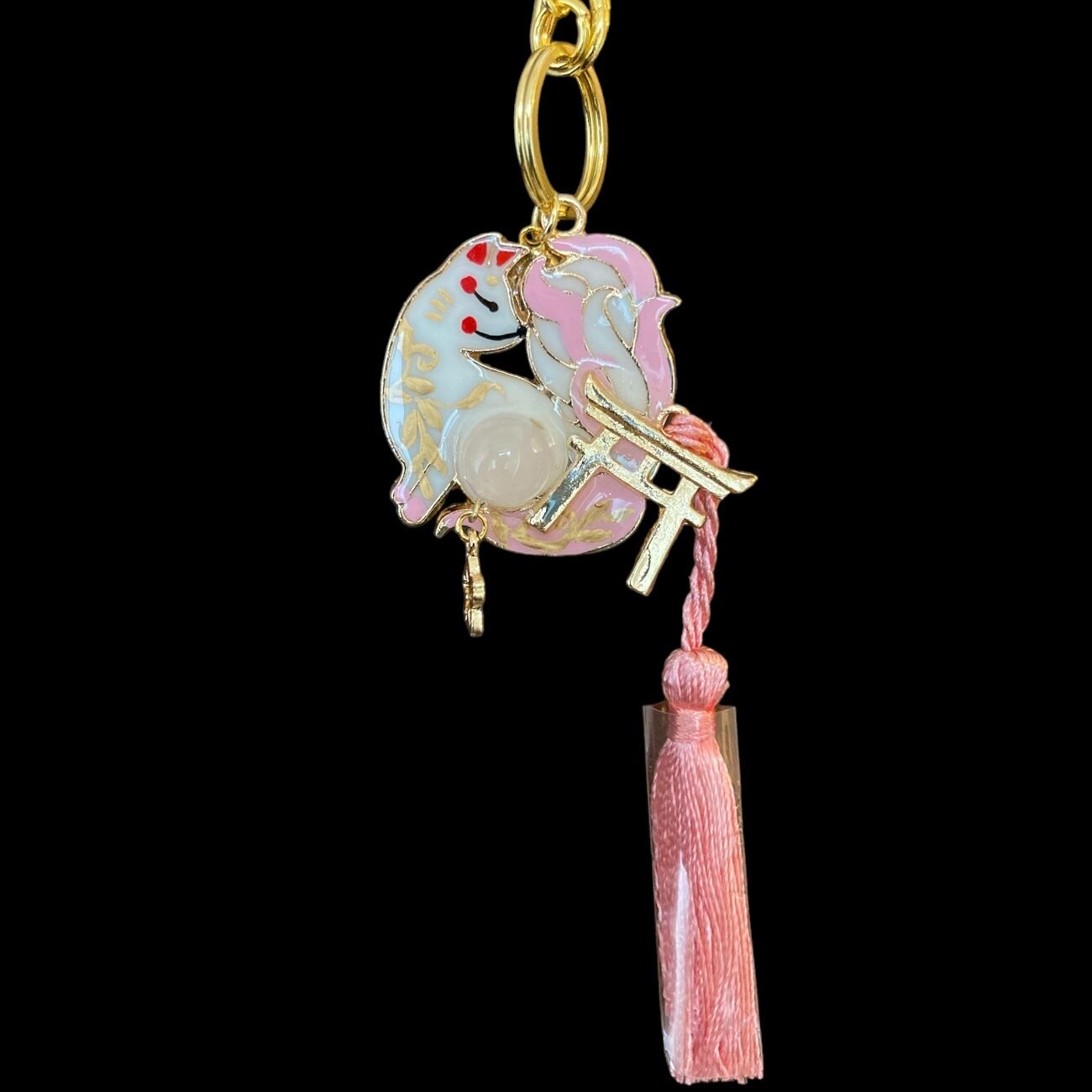 No,38 御天狐守り 白 キツネのお守り 天然石・ローズクォーツ付き デザイナーmasuramiの手描きレジン作品 Handmade fox charm きつねのお守り 京都お守りチャーム