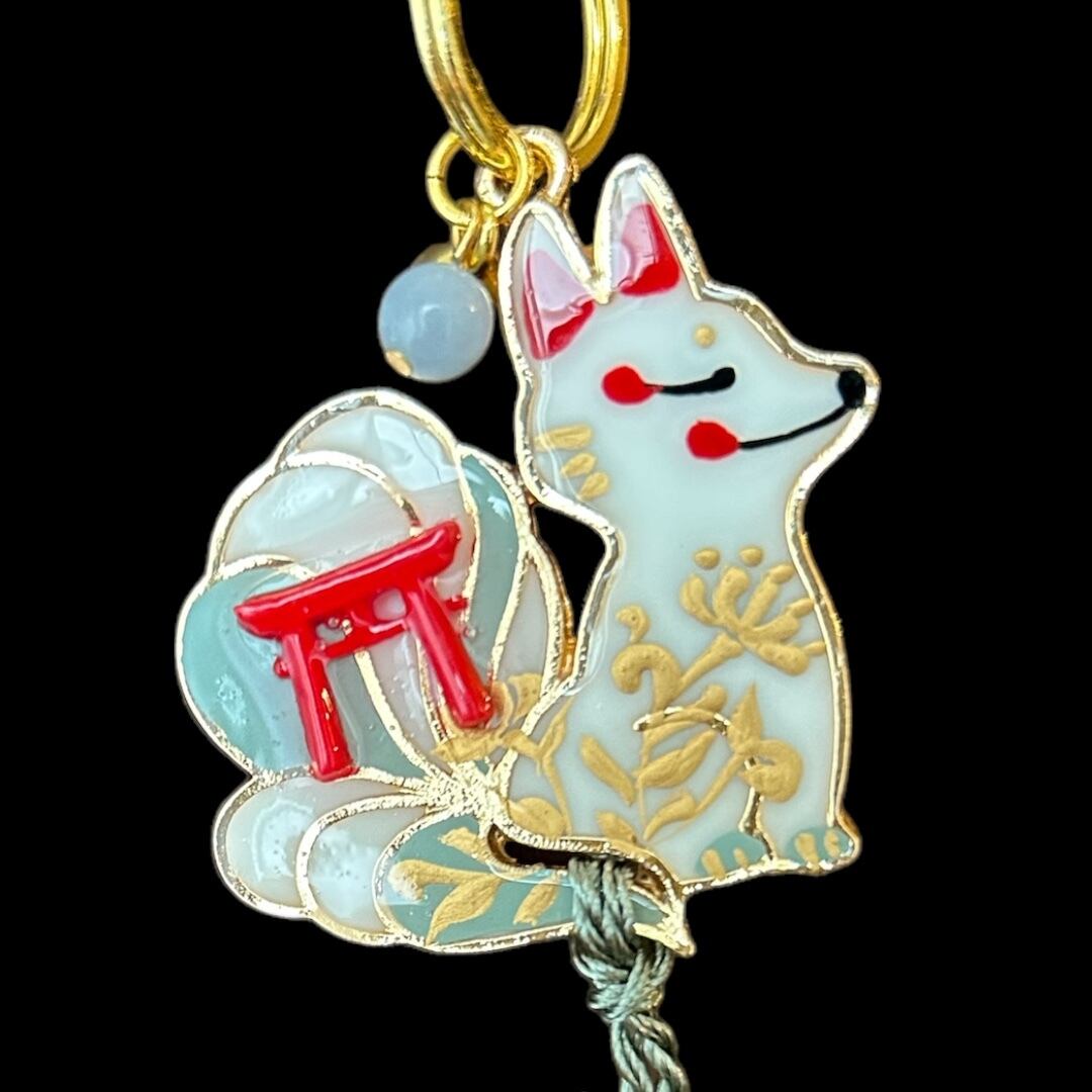 No,46子天狐守り 白 キツネのお守り 天然石・エンジェライト付き デザイナーmasuramiの手描きレジン作品 Handmade fox charm きつねのお守り 京都お守りチャーム