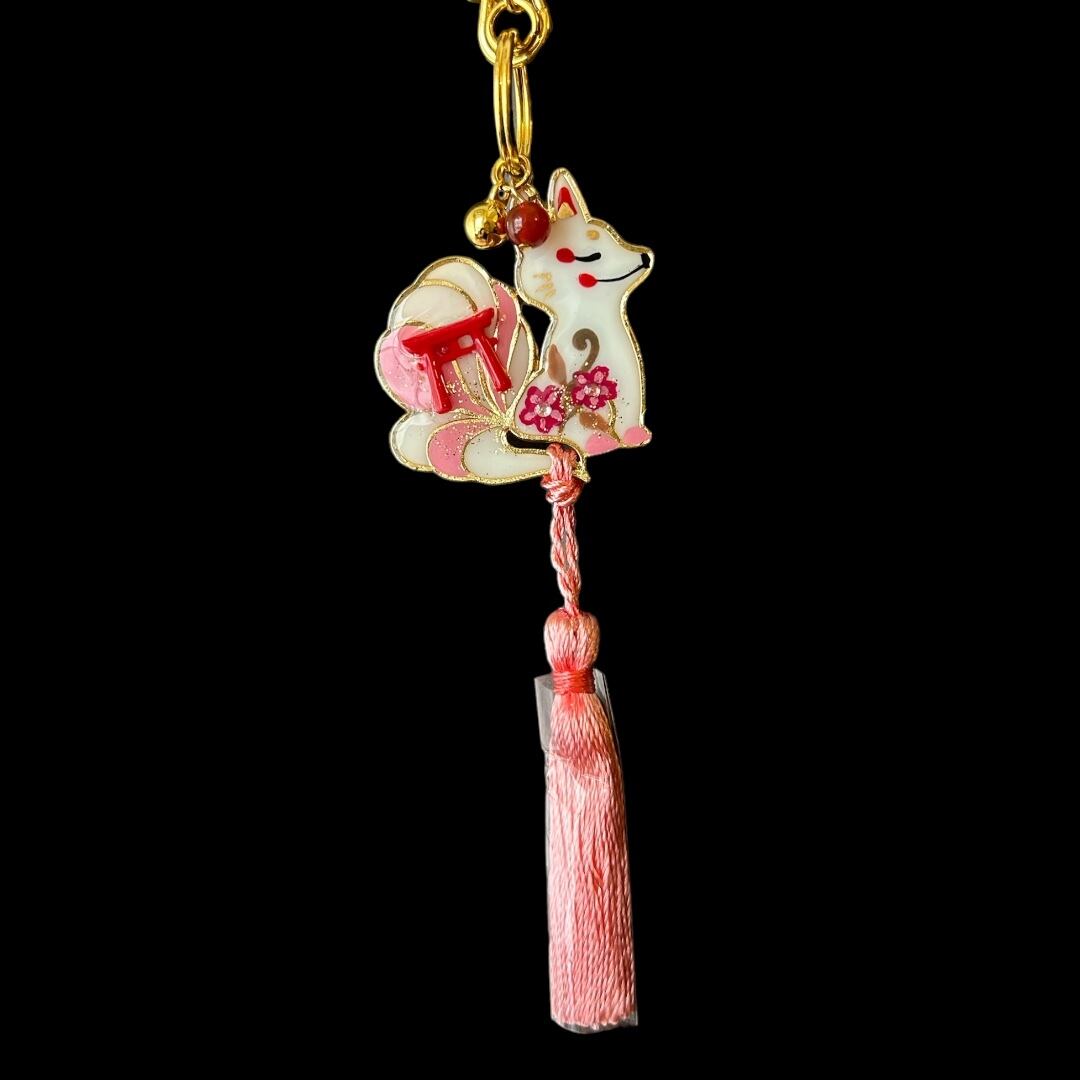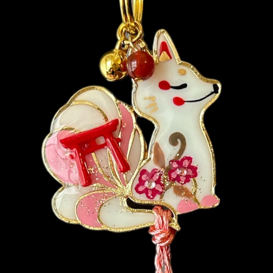 その2匹の狐が パワーストーンや鳥居のシンボル、邪気を払う鈴をまとい、デザイナーmasuramiの絵付けによって命を吹き込まれ、美しく可愛らしい御守りとして誕生しました。