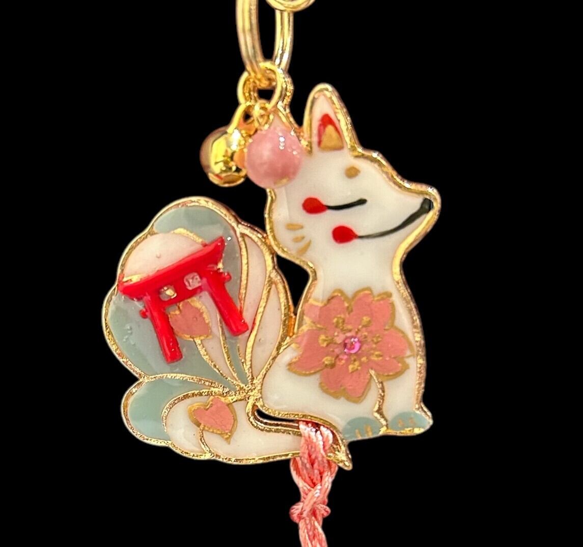 No,56 子天狐守り 白 キツネのお守り 天然石・ピンククォーツ付き デザイナーmasuramiの手描きレジン作品 Handmade fox charm きつねのお守り 京都お守りチャーム